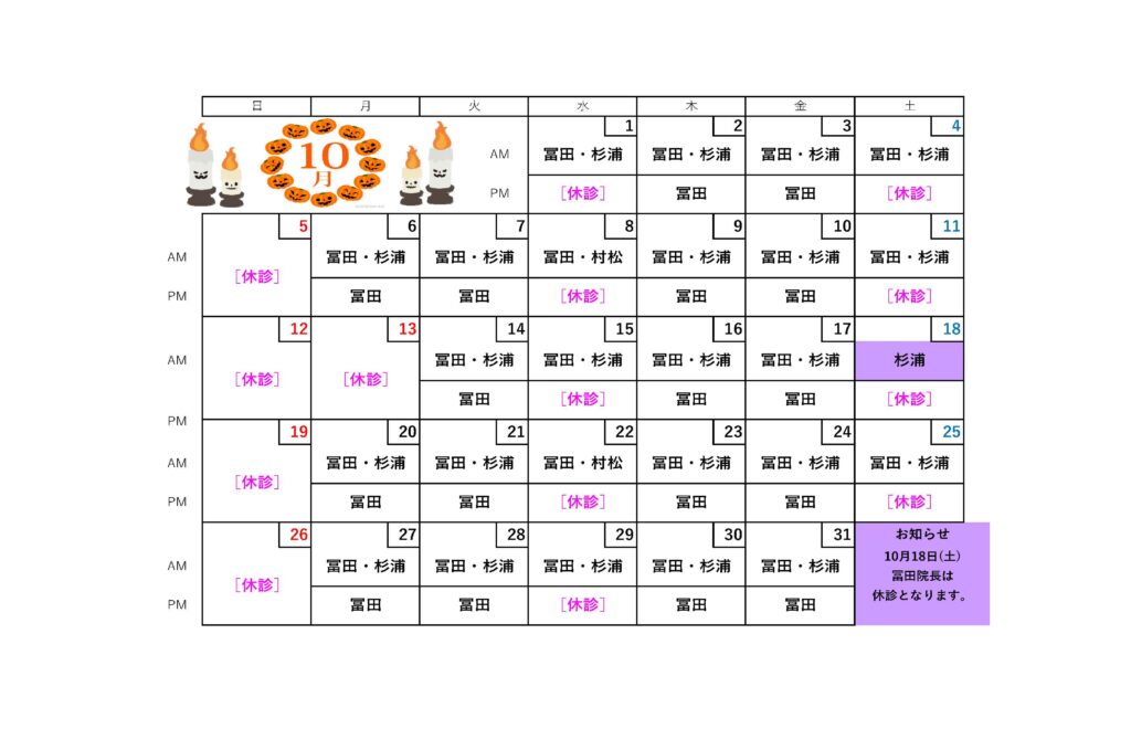 2025年10月の診療体制についてお知らせします。8日(水)と22日(水)は村松医師が診療を担当し、杉浦医師はお休みとなります。また、18日(土)は冨田院長が不在のため、杉浦医師が代診いたします。それ以外の日は通常通り診療を行います。ご来院の際はご確認ください。