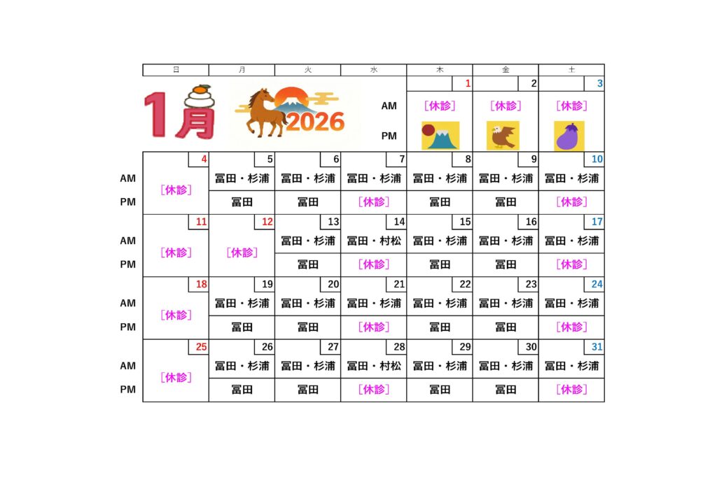 2026年1月の診療体制についてお知らせします。14日(水)と28日(水)は杉浦医師が休診となり、その日は村松医師が診察を担当します。冨田院長はこれらの日も含めて休みなく診療いたします。また、静岡市のインフルエンザワクチン助成は1月末までの期間限定です。助成を利用すると自己負担が軽減されるため、該当の方は接種を検討されている方はお早めの予約をおすすめします。季節の変わり目に備え、安心して受診いただける体制を整えております。