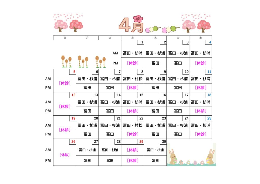 2026年3月の診療体制についてお知らせします。7日(土)は院長が休診となり、杉浦医師が担当いたします。11日(水)と25日(水)は、村松医師と冨田院長が診療を行い、杉浦医師はお休みです。各医師の診療日を事前にご確認いただくことで、スムーズに受診いただけます。季節の変わり目で体調に不安がある方も、専門医による丁寧な診察で安心してご相談ください。日程の調整に役立つ情報を随時更新してまいります。